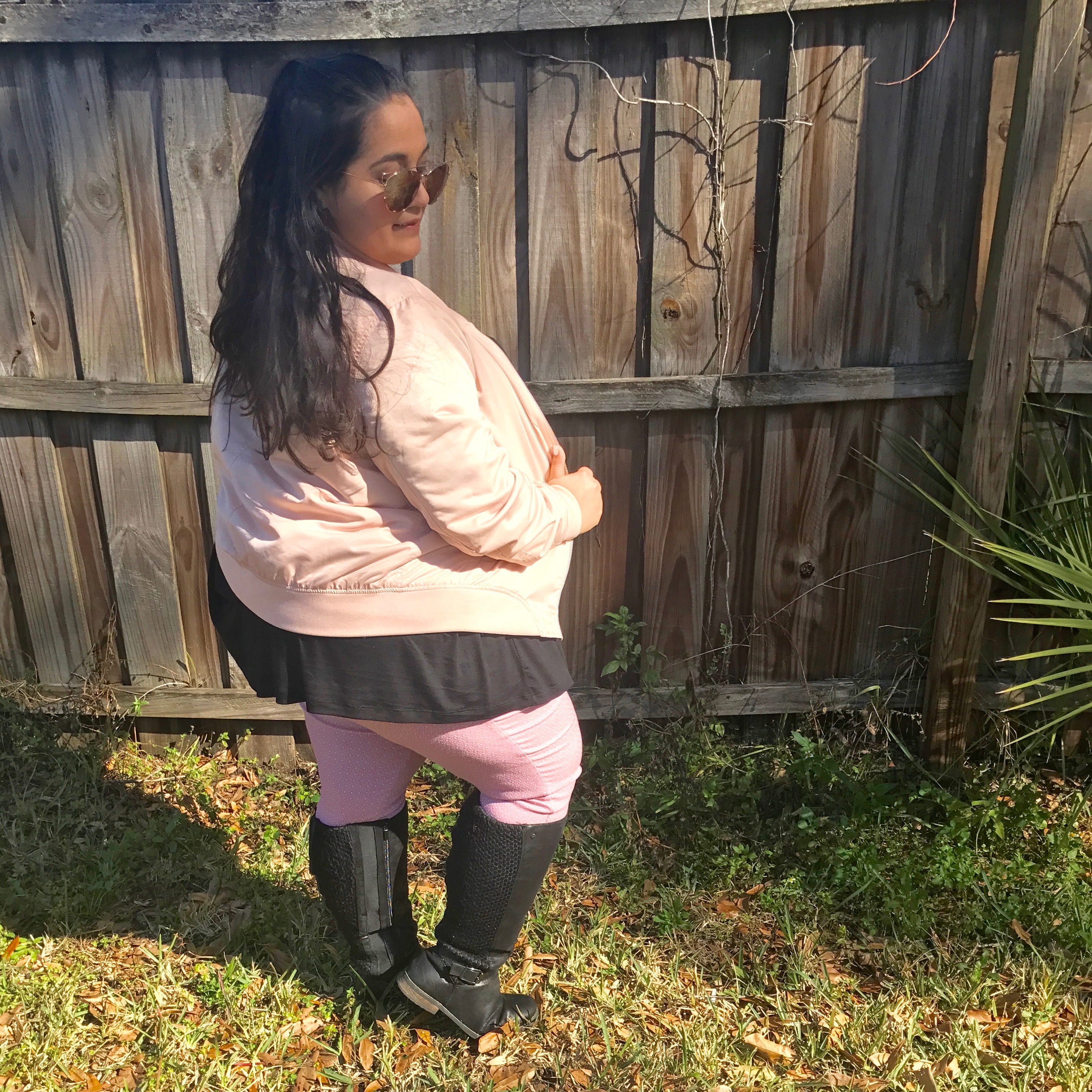 My jacket pink bomber jacket is from Forever 21 and is light enough for the chilly nights during the month of February! My sunglasses are rose gold from Ross.